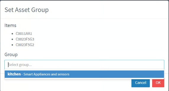 Selecting one or several devices will display new buttons in the upper area of the list. Pressing the green "Set Type" button, a new context will be displayed where the asset type can be selected by means of a drop-down list.