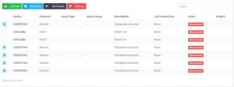 To start adding devices to the new Asset Type, you must access the devices section of the main menu and display the Devices List. Note that each device can be selected by means of a checkbox on the left side of the list.