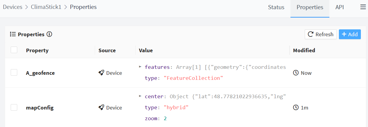Note that, when a new geofence is created, the device (or each device of the type/group) will obtain two properties from the geofences configuration. These properties can be checked or edited in the device (Asset/group) properties section: